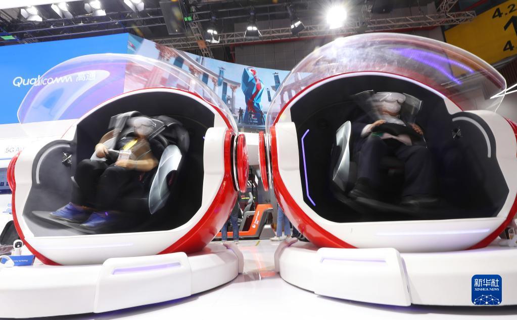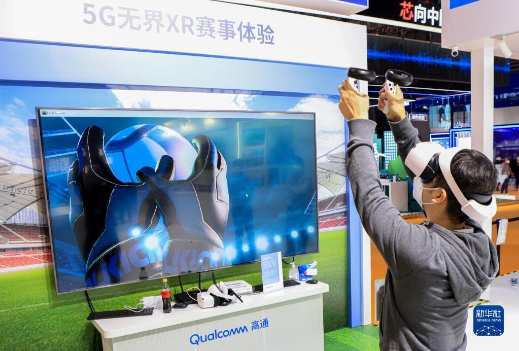11月7日,參觀者在第五屆進(jìn)博會(huì)美國(guó)高通公司展臺(tái)參與5G無(wú)界XR賽事體驗(yàn)。新華社記者 李京 攝