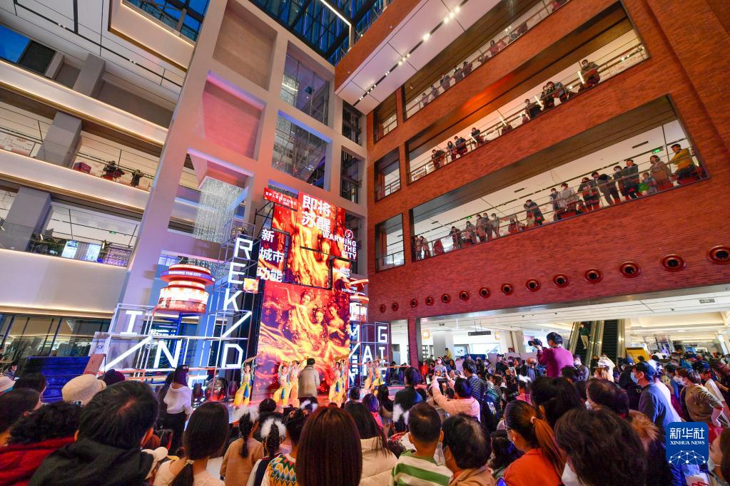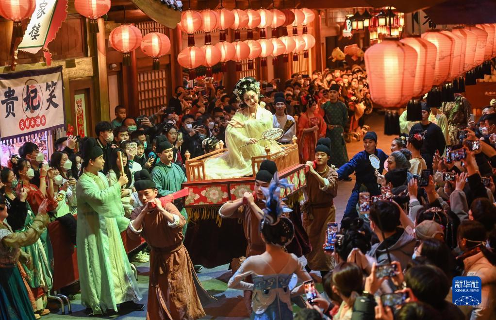 2022年12月31日,游客在陜西西安長(zhǎng)安十二時(shí)辰主題街區(qū)觀看表演。新華社發(fā)(鄒競(jìng)一 攝)