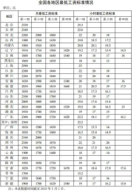 全國各地區(qū)最低工資標(biāo)準情況(截至2023年1月1日),來自人社部網(wǎng)站