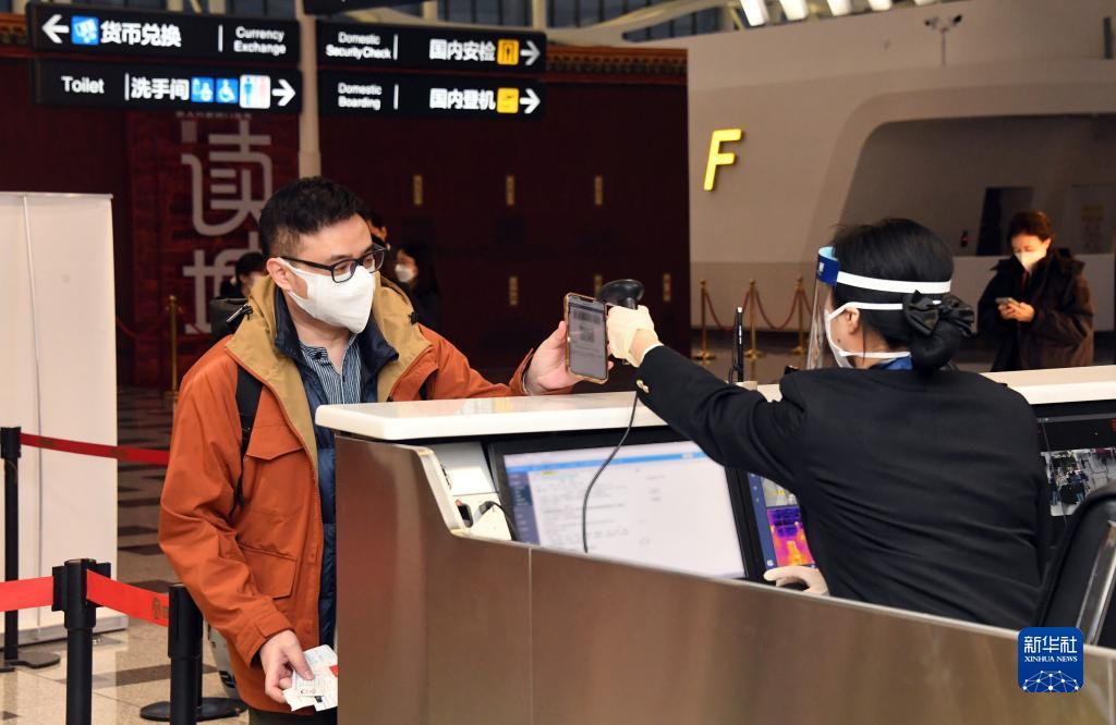 1月17日,在北京大興機(jī)場(chǎng),海關(guān)關(guān)員準(zhǔn)備核驗(yàn)乘坐CZ309次北京飛往香港航班旅客的海關(guān)健康申報(bào)二維碼。新華社記者 任超 攝