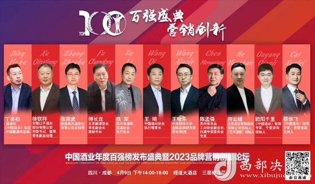 西部決策網(wǎng)訊(記者劉玉 韓宗憲)聚焦中國酒業(yè)百強(qiáng)群英,助力品牌營銷創(chuàng)新管理。4月9日,中國酒業(yè)年度百強(qiáng)榜發(fā)布盛典暨2023品牌營銷創(chuàng)新論壇在成都盛大開啟。行業(yè)各協(xié)會領(lǐng)導(dǎo)、智庫專家、意見領(lǐng)袖及全國200家企業(yè)和經(jīng)銷商代表,共同見證行業(yè)百強(qiáng)與酒業(yè)營銷人的風(fēng)采。