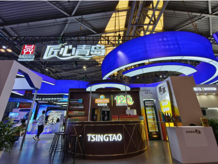 與往年展會不同,青島啤酒在展臺設(shè)計上,一枚紅、綠、金三色勾勒的120周年紀念標識,格外引人注目,試飲杯中、啤酒泡沫上,紀念標識的拉花與之呼應(yīng)成趣。