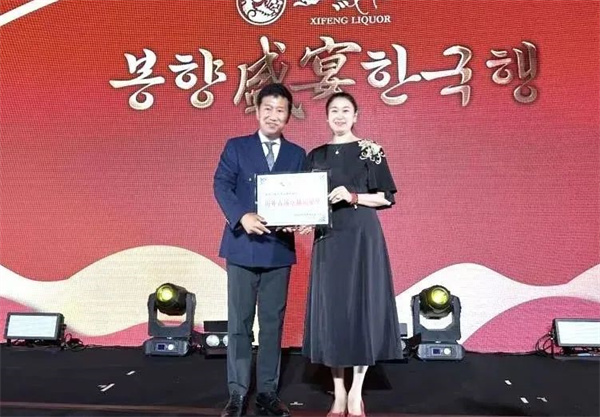 自進(jìn)入韓國市場以來,西鳳酒以大氣雅致的包裝、卓越優(yōu)秀的品質(zhì)、醇香甘美的口感贏得了廣大消費(fèi)者的喜愛,銷售業(yè)績連年翻倍增長,并連續(xù)兩年榮獲“韓國酒類鑒賞大賽”特等獎及“Best of 2023”大獎。會上,陜西西鳳酒股份有限公司副總經(jīng)理、營銷公司總經(jīng)理周艷花為韓國華岡酒業(yè)株式會社頒發(fā)“海外拓展獎”,對金嵐洙社長及其團(tuán)隊(duì)為西鳳酒市場拓展所做出的的努力表示感謝。