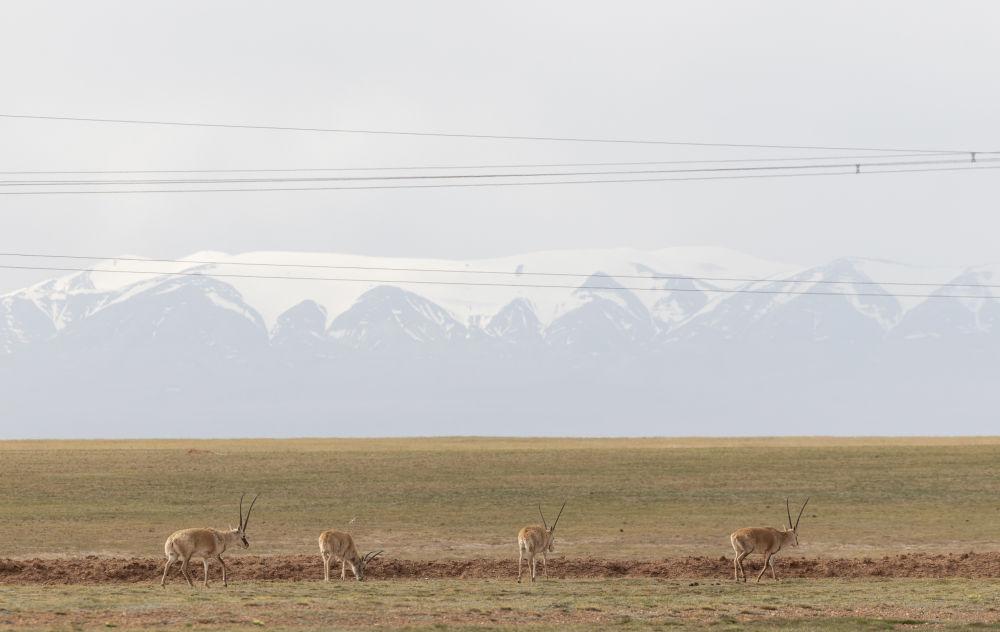 6月15日,在長江源地區(qū)的楚瑪爾河附近,幾只藏羚羊在覓食。