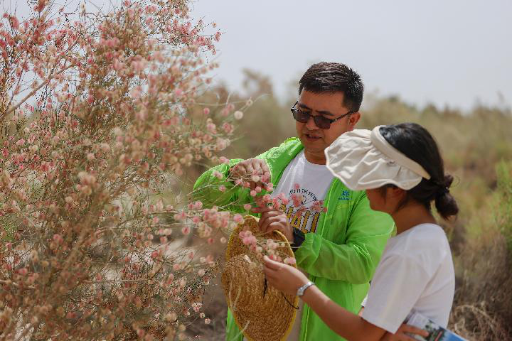 2023年6月12日,在中科院新疆生態(tài)與地理研究所策勒沙漠研究站天然試驗(yàn)區(qū),買(mǎi)爾當(dāng)和學(xué)生查看沙拐棗生長(zhǎng)情況。新華社記者 郝昭 攝