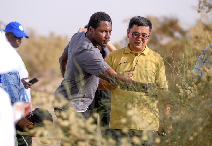 2023年6月13日,在中科院新疆生態(tài)與地理研究所策勒沙漠研究站天然實(shí)驗(yàn)區(qū),中國(guó)科研人員買(mǎi)爾當(dāng)(右一)為參加第二屆非洲綠色長(zhǎng)城建設(shè)技術(shù)培訓(xùn)班的學(xué)員講解。新華社記者 王菲 攝
