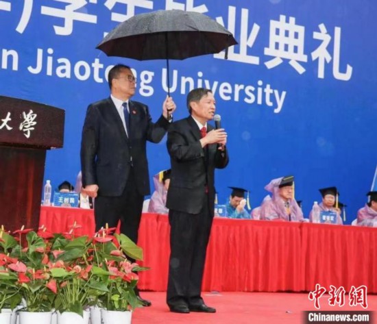圖為西安交通大學(xué)畢業(yè)典禮當(dāng)日,該校黨委書記盧建軍為校長(zhǎng)王樹國(guó)撐傘?!∥靼步煌ù髮W(xué)供圖