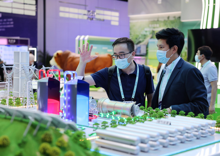 5月26日,觀(guān)眾在在中關(guān)村國(guó)家自主創(chuàng)新示范區(qū)展示中心了解100MW先進(jìn)壓縮空氣儲(chǔ)能技術(shù)。新華社記者 張晨霖 攝