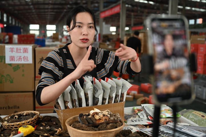 福建省寧德市近年來加大電商人才培育,推動鄉(xiāng)村振興和經(jīng)濟高質量發(fā)展。圖為不久前的一處農產(chǎn)品深精加工車間內,當?shù)匾幻娚讨鞑フ诮榻B羊肚菌產(chǎn)品。新華社記者 林善傳攝