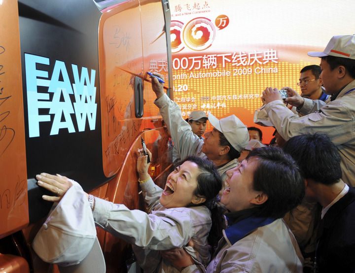 2009年10月20日,一汽解放的工人們?cè)谧约河H手生產(chǎn)的2009年中國(guó)第1000萬(wàn)輛車上簽名。新華社記者 蔣林 攝