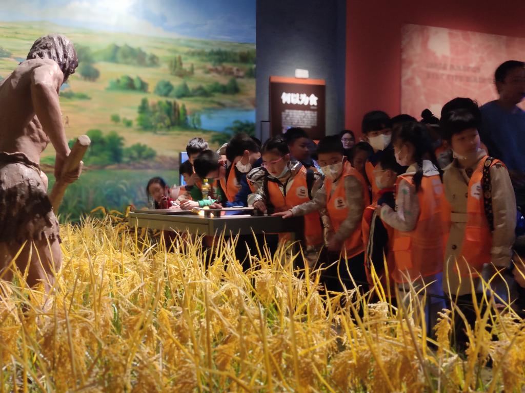 2023年3月,在新津?qū)毝者z址展廳,孩子們?cè)趨⒂^(guān)4500年前的碳化水稻。(陳煒森 攝)