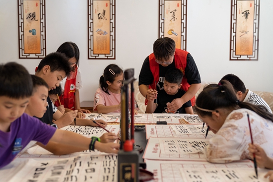7月10日,在安徽省合肥市肥東縣店埠鎮(zhèn)新城社區(qū)暑托班上,志愿者在給孩子們上書法課。阮雪楓/攝(新華社發(fā))