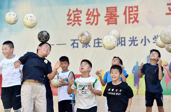 暑假期間,為減輕家長負擔,有效緩解學生暑期“看護難”問題,部分學校、社區(qū)開展暑期免費托管,為學生提供作業(yè)輔導和素質課程等服務,讓孩子們度過一個快樂、有意義的假期。 圖為7月10日,在石家莊市陽光小學,學生進行足球訓練。張曉峰/攝(新華社發(fā))