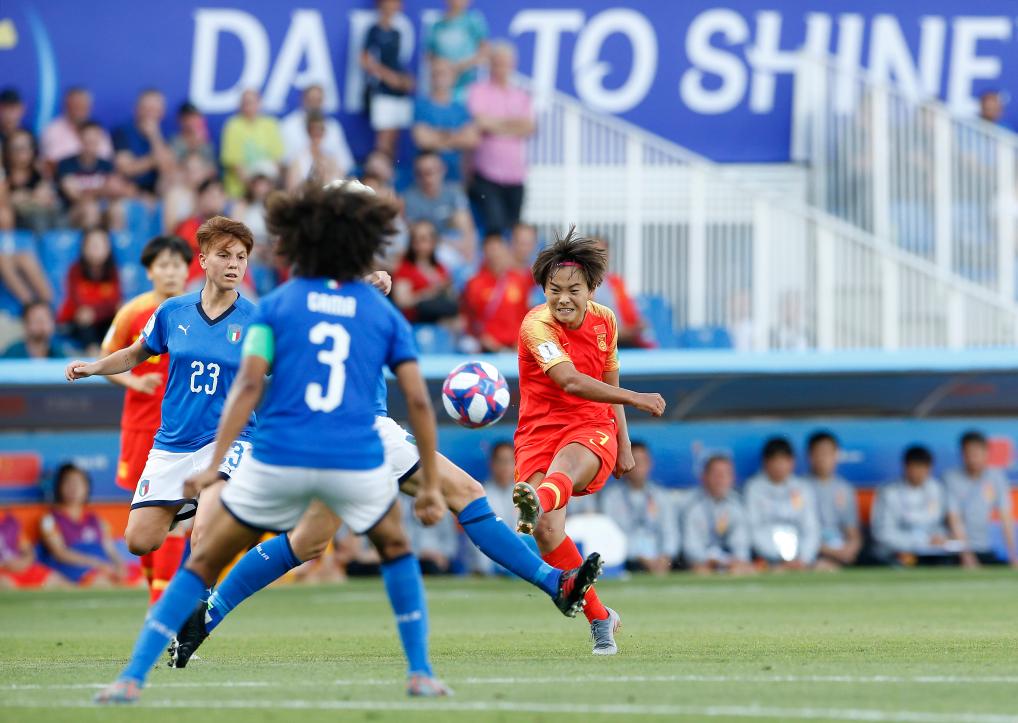 2019年6月25日,中國隊球員王霜(右一)在比賽中射門。當日,在法國蒙彼利埃舉行的2019年國際足聯(lián)女足世界杯16強賽比賽中,中國隊以0比2不敵意大利隊,無緣八強。新華社記者丁旭攝