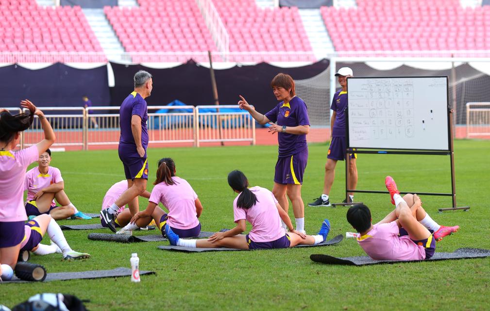 7月5日,中國女足主教練水慶霞(右三)點評訓練情況。新華社記者丁旭攝