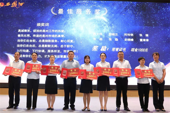 西鳳股份公司總經(jīng)理助理趙永紅為市級經(jīng)理銷售卓越獎獲得者頒發(fā)榮譽(yù)證書與獎金