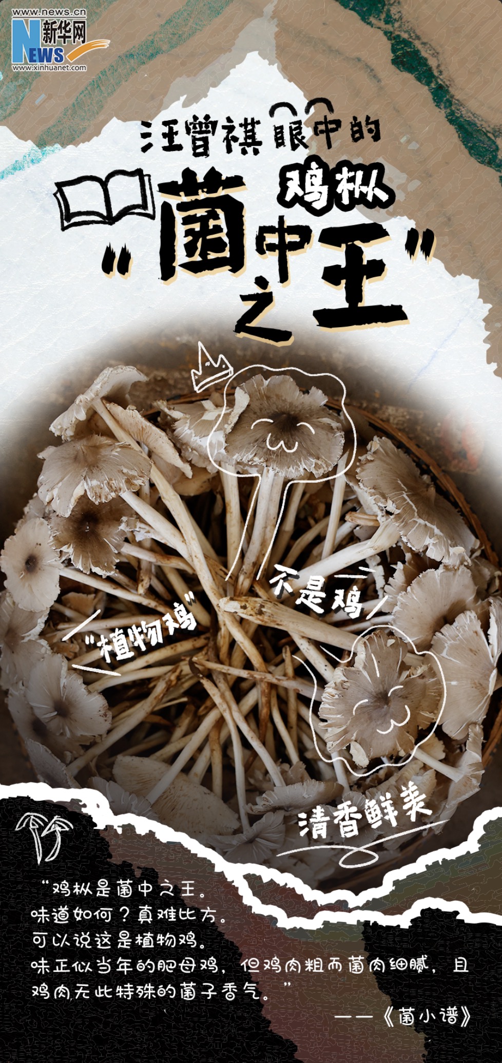 雞樅是當(dāng)之無愧的菌中之王,味道鮮濃,無可方比。在《昆明的吃食》一文中,汪曾祺記錄下了許多他鐘愛的美食。談及雞樅,他說:“雞樅有一股清香,入口無渣,甚滑。”在品嘗雞樅后,更是用“腴”一字概括雞樅的鮮美口感。