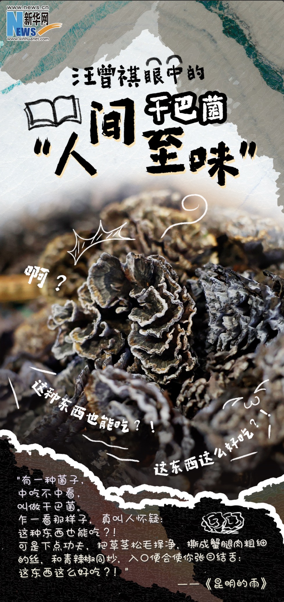 在《七載云煙·采薇》的打油詩中,他寫到“人間至味干巴菌,世上饞人大學(xué)生。”果然,越是獨(dú)特的東西,越招人喜歡。在《昆明食菌》一文中,汪老說,干巴菌是“菌子里味道最深刻”的,它無疑給了汪老一個(gè)大大的驚喜!