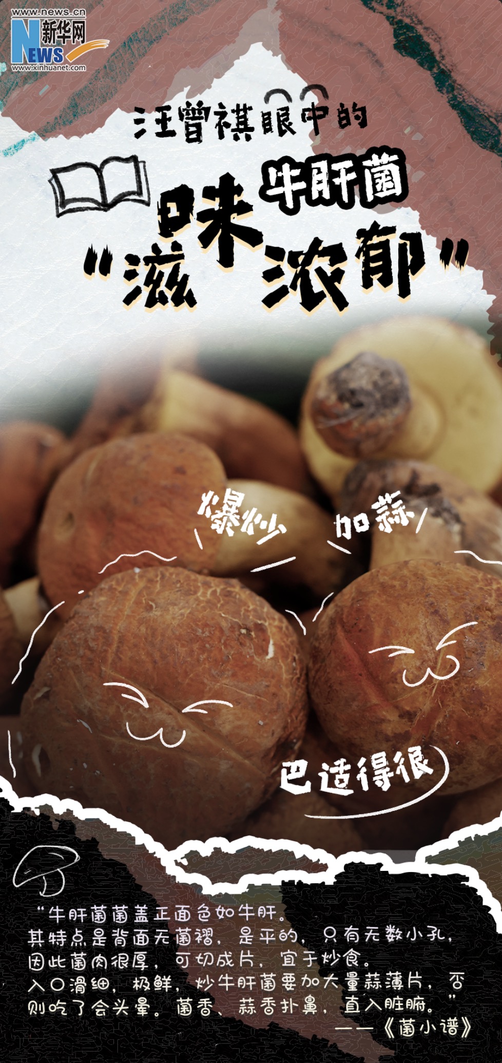 牛肝菌,色如牛肝,滑、嫩、鮮、香,較之于其他菌,肥碩鮮美,滋味濃郁,吃起來有肉的質(zhì)感,聞起來有土壤的清香。但是牛肝菌迷人也危險(xiǎn),在炒熟的情況下,汪老建議“炒牛肝菌須多放蒜”。
