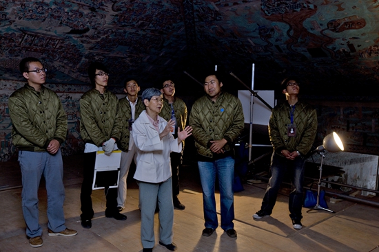 樊錦詩(shī)在莫高窟第85窟壁畫修復(fù)現(xiàn)場(chǎng)檢查工作。