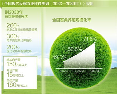 規(guī)模化設(shè)施化養(yǎng)殖助推畜牧業(yè)綜合產(chǎn)能提升?!度珖?guó)現(xiàn)代設(shè)施農(nóng)業(yè)建設(shè)規(guī)劃(2023—2030年)》(以下簡(jiǎn)稱《規(guī)劃》)提出,到2030年建設(shè)完成260個(gè)家禽立體高效設(shè)施養(yǎng)殖場(chǎng)、200個(gè)肉牛高效集約養(yǎng)殖場(chǎng)、300個(gè)肉羊高效集約養(yǎng)殖場(chǎng)和200個(gè)現(xiàn)代化奶牛智慧牧場(chǎng),增加肉產(chǎn)量150萬(wàn)噸以上、雞蛋產(chǎn)量15萬(wàn)噸以上、奶類產(chǎn)量160萬(wàn)噸以上,我國(guó)的肉蛋奶供應(yīng)保障水平將進(jìn)一步提高。