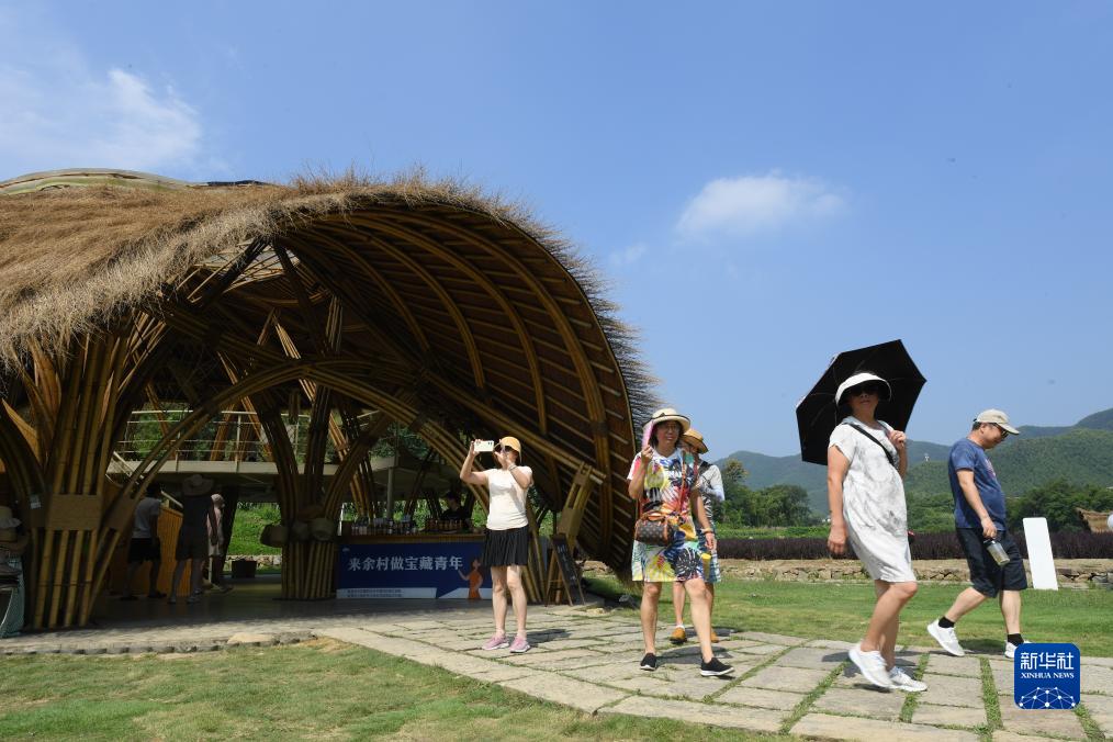 8月11日,游客在安吉余村參觀用當地盛產的竹材料建造的建筑。