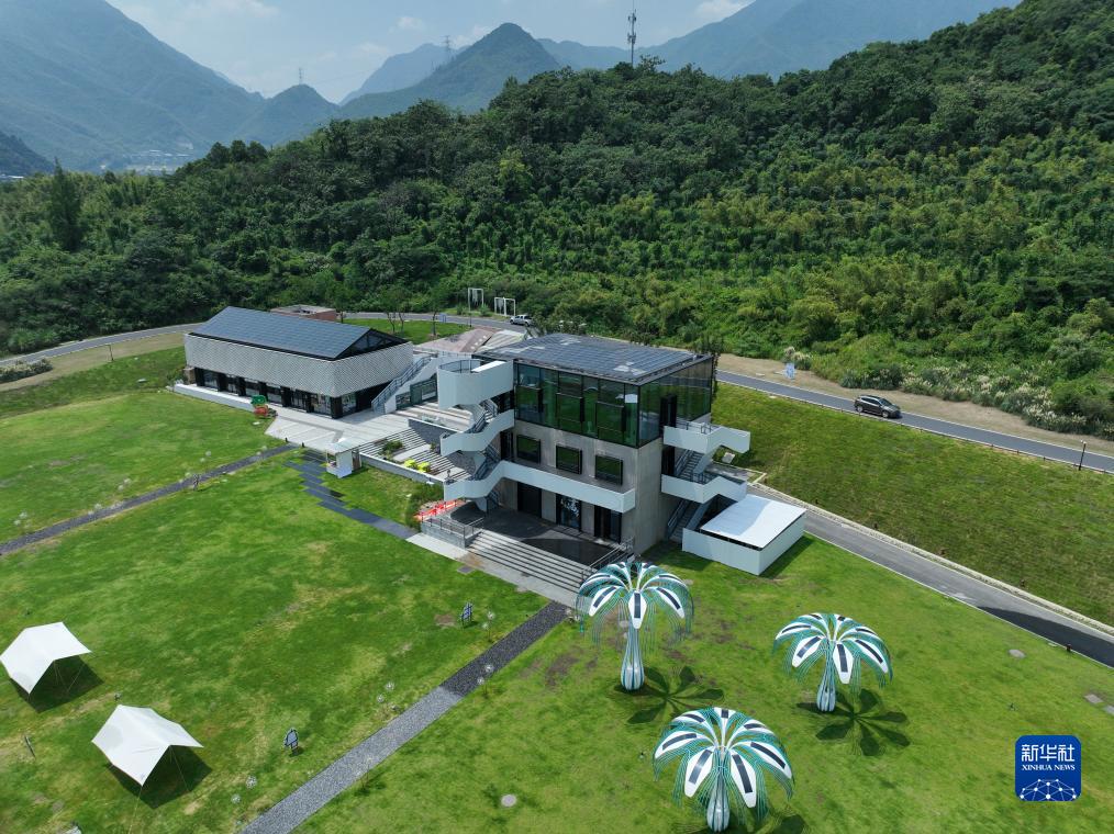 8月11日拍攝的余村未來圖書館,該建筑主要通過鋪設在屋頂上的光伏發(fā)電系統(tǒng)和“光伏樹”供電(無人機照片)。