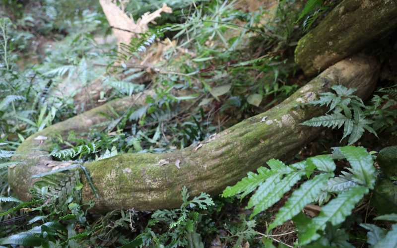 藤是蔓生植物,柔軟,細長。平時見到的藤蔓,最粗也不過手腕般粗。而眼前這根巨藤,乍一看,竟以為是伏臥在山谷間的一棵大樹。只有走上前去,順著它筋骨畢露的軀干,一路尋向它躍入林梢的身影,才能確認它的確是一根藤。然而,也只能看清它橫跨山谷間的一截身段而已,根本見不到它飛騰盤繞在樹冠之上的龐大身軀。一根柔軟的藤長大到你的經驗之外,真是太驚悚了。難道成精了?那它要歷經多少輪回的修煉?才有如此正果。