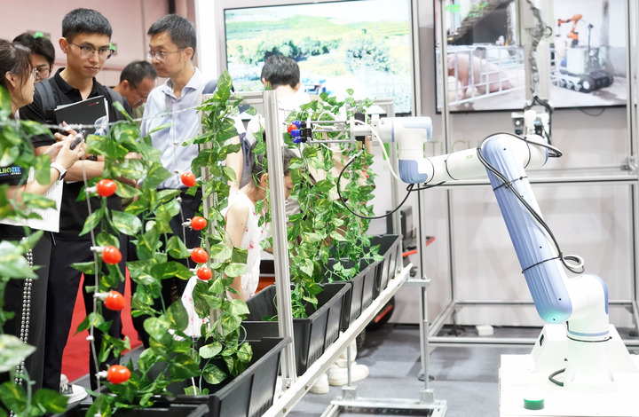 在農(nóng)業(yè)展區(qū),碩大的果園多臂采摘機(jī)器人引人注目。機(jī)械手臂通過(guò)位置和光感靈敏伸出準(zhǔn)確抓住一個(gè)蘋果,讓觀眾對(duì)農(nóng)業(yè)現(xiàn)代化和智能化有了更直觀的了解。這款機(jī)器人由北京市農(nóng)林科學(xué)院智能裝備技術(shù)研究中心研制,通過(guò)機(jī)械臂和果實(shí)獲取裝置,實(shí)現(xiàn)采果、納果、儲(chǔ)果全程自動(dòng)化采收,并具備晝夜連續(xù)作業(yè)的能力,每小時(shí)可以采摘400至550果,大幅提升了采摘效率。