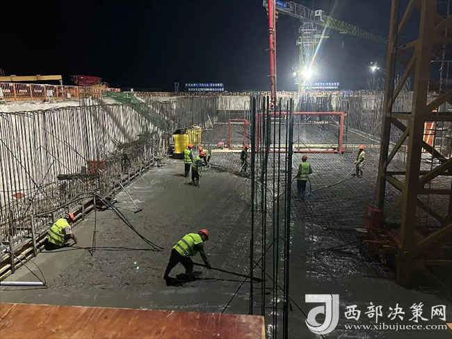 九層之臺(tái),始于壘土。筏板作為基礎(chǔ)工程最重要的組成部分,其質(zhì)量的好壞直接影響到上部結(jié)構(gòu)的穩(wěn)固性。在完成筏板鋼筋綁扎后,2臺(tái)長臂泵車、34輛混凝土罐車開始送料。澆筑期間,映入眼簾的是一片繁忙之景,22名管理人員,110余名勞務(wù)人員正以時(shí)不我待的緊迫感,全力以赴抓緊抓實(shí)項(xiàng)目建設(shè),共同助力項(xiàng)目建設(shè)跑出加速度。