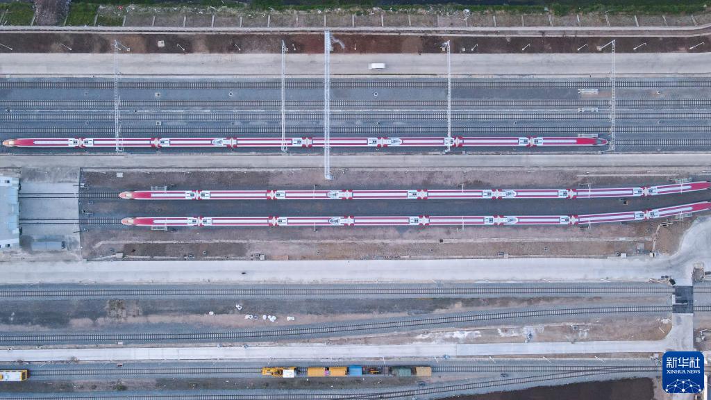 7月20日,雅萬(wàn)高鐵列車??吭谟《饶嵛鱽喨f(wàn)隆德卡魯爾動(dòng)車所附近(無(wú)人機(jī)照片)。新華社記者 徐欽 攝