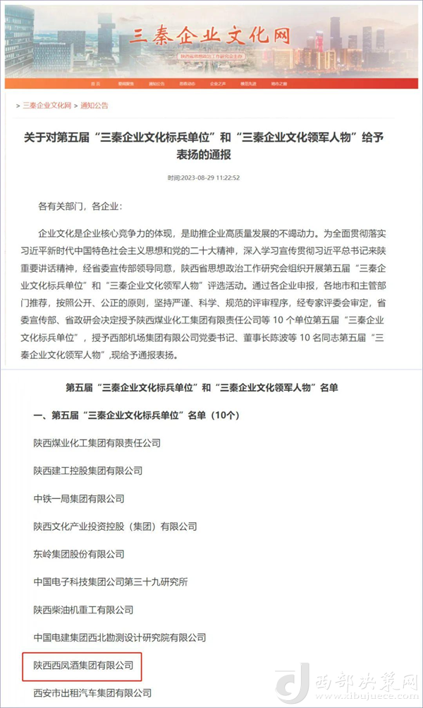 西部決策網(wǎng)訊(記者劉玉 韓宗憲 通訊員 馬迪)近日,從陜西省委宣傳部、陜西省思想政治工作研究會傳來喜訊,西鳳集團公司以在企業(yè)文化建設(shè)方面的突出成績,從眾多評選單位中脫穎而出,獲得“三秦企業(yè)文化標(biāo)兵單位”光榮稱號。