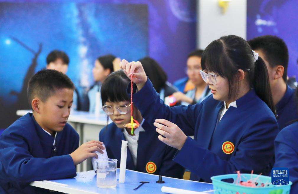 9月21日,在內蒙古阿拉善盟額濟納旗,學生在做趣味實驗。新華社發(fā)(敖琪 攝)