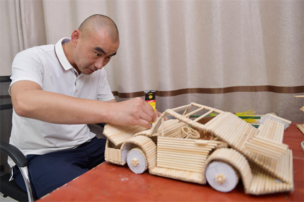編制了一段時間的小手鏈、小掛件、小燈籠等等小工藝品后,楊波購買了一次性筷子自己做了一個煙盒。這個煙盒只要一按按鈕,煙支就會自動彈出,而且煙嘴朝上。隨后,楊波又購買了許多一次性筷子,做一輛轎車模型,不曾想,等到了安裝擋風(fēng)玻璃時,小轎車散架了。分析原因,是因為圓柱狀筷子之間的粘和面積太小不牢靠。楊波找了一些紙板當墊板,使筷子的粘和面變成2處,牢固程度提高1倍,前前后后有10多天,一輛筷子車模做成功了。