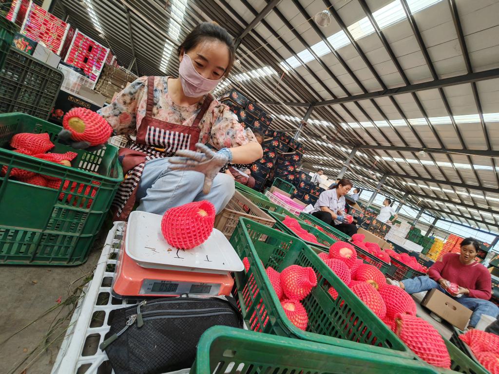9月19日,會理市鹿廠鎮(zhèn)白草村農(nóng)產(chǎn)品物流園區(qū),務(wù)工人員正在分揀石榴果。新華社記者江毅 攝