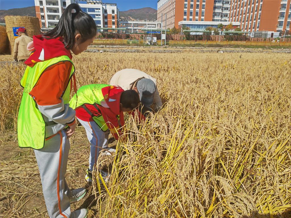 10月20日,小學生在工作人員的帶領下體驗收割水稻。新華社記者 魏飚 攝
