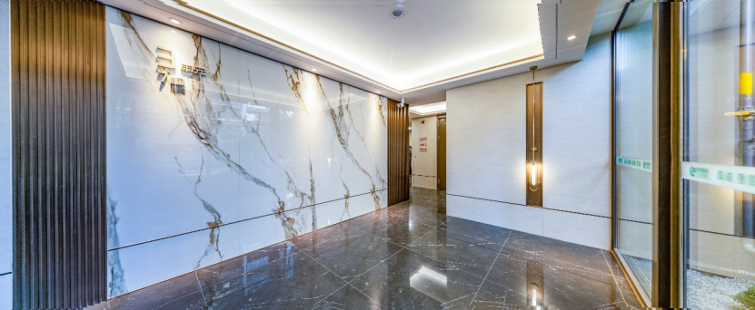 更值得一提的是,綠城·桂語朝陽項(xiàng)目不僅提前交付,還在公區(qū)品質(zhì)、園林景觀等多個(gè)方面進(jìn)行了升級,如入戶單元精裝大堂,以卡拉卡金巖板背景墻取代此前的瓷磚,雖然成本上升,但高級質(zhì)感墻面,結(jié)合跌級吊頂搭配金屬嵌條,與900x1800大規(guī)格墻面瓷磚,高級灰色系地面瓷磚搭配,所呈現(xiàn)出的奢雅入戶感,迎面而來。