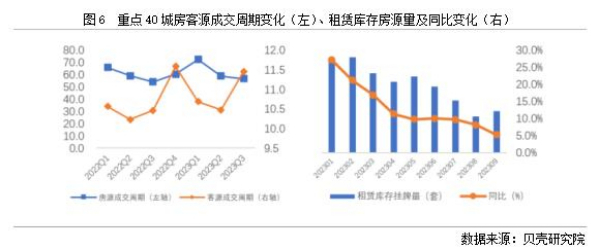 依據(jù)貝殼研究院數(shù)據(jù)監(jiān)測,全國重點40城2023年三季度房客源成交周期分別為56.7、11.5天,房源成交周期環(huán)比減少2.1天,同比增加2.7天;客源成交周期環(huán)比延長1天,同比延長1天。隨著個人租賃房源供應的增加,疊加保障性租賃住房、市場化集中式租賃房源的增加,個人業(yè)主出租房源出租速度減緩。從庫存房源來看,2023年1-9月租賃庫存房源量均呈現(xiàn)同比增加的趨勢,與此同時,租客租房面臨的選擇項增多,租客對于租賃房源可選類型和房源量均有增加。