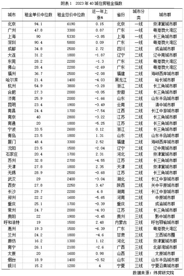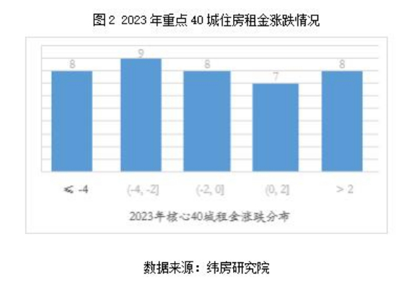 從漲跌結(jié)構(gòu)看,緯房研究院數(shù)據(jù)顯示,2023年重點40城中有15個城市住房租金同比上漲,其余25個城市住房租金同比下降。住房租金上漲的城市中,7個城市漲幅在2%以內(nèi),8個城市漲幅超過2%;住房租金下跌的城市中,8個城市跌幅在2%以內(nèi),9個城市跌幅在2-4%;8個城市跌幅超過4%。