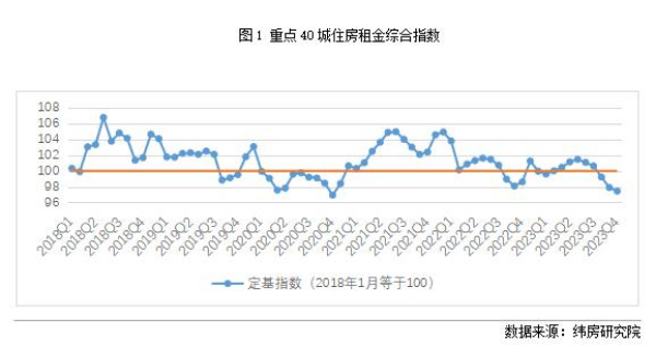 分時間段來看,住房租金總體呈現(xiàn)先升后降的趨勢。受到校畢業(yè)生租房需求增加的影響,住房租金水平波動上漲,從2022年末的98.61漲至2023年7月的101.45。隨著需求的釋放,住房租金隨后進入下降趨勢,核心40城租金指數(shù)降至2023年末的97.44。2023年末的租金水平與2022年末相比,下降了1.19%。租金水平雖有所下降,但總體穩(wěn)定,未出現(xiàn)大起大落。
