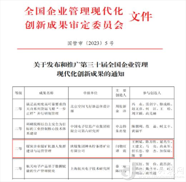 西部決策網(wǎng)訊 近期,全國(guó)企業(yè)管理現(xiàn)代化創(chuàng)新成果審定委員會(huì)印發(fā)《關(guān)于發(fā)布和推廣第三十屆全國(guó)企業(yè)管理現(xiàn)代化創(chuàng)新成果的通知》。檸條塔礦業(yè)公司管理創(chuàng)新成果《煤炭企業(yè)煤礦機(jī)器人集群建設(shè)與運(yùn)營(yíng)管理》獲二等獎(jiǎng),是陜煤集團(tuán)所屬煤炭生產(chǎn)企業(yè)唯一一家獲獎(jiǎng)單位。
